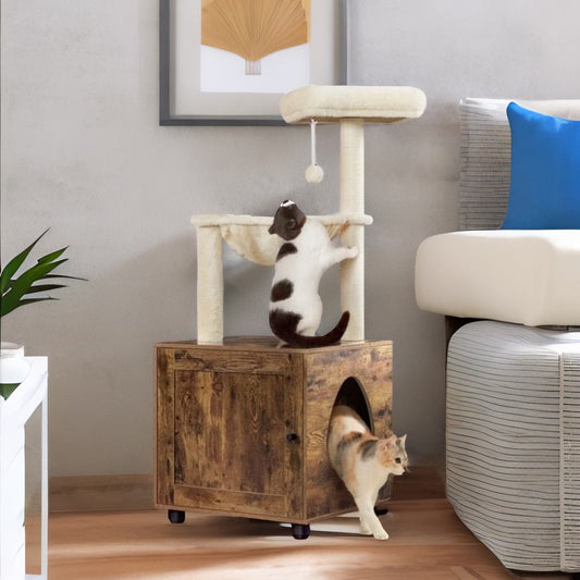 Cat Litter Box Enclosure With Tree Tower Brown