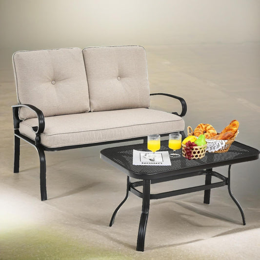 2 Seater Outdoor Bench With Padded Cushions And Table Cream