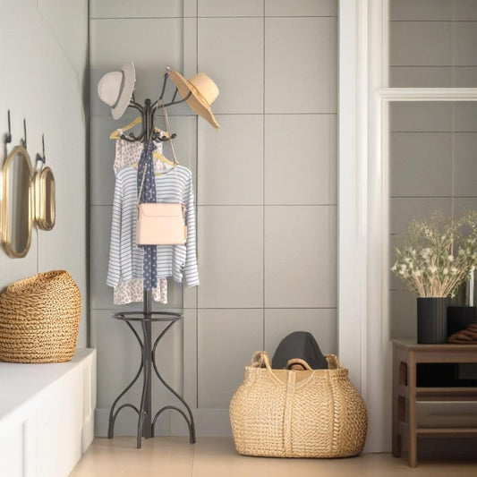 Metal Coat Stand With 8 Hooks and Umbrella Holder Black