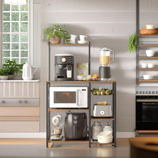 4 Tier Kitchen Bakers Rack With Shelves and Hooks Rustic Brown