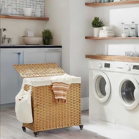 3 Compartment Laundry Basket With Removable Bags And Wheels Natural Brown