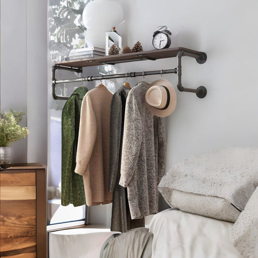 Industrial Heavy Duty Pipe Wall-Mounted Floating Shelf With Hanging Rail Brown