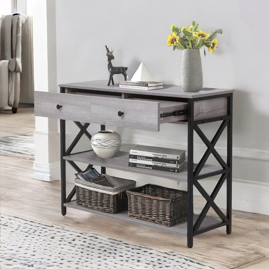 3 Tier Console Table With 2 Drawers And Storage Shelves Grey