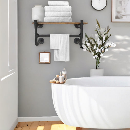 Industrial Pipe Wall-Mounted Floating Shelf With Hanging Rail Brown