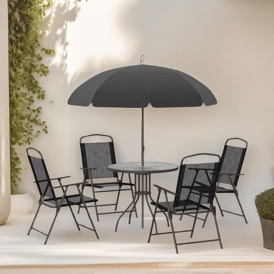 Set of 6 Patio Bistro Set With Parasol And Table Black