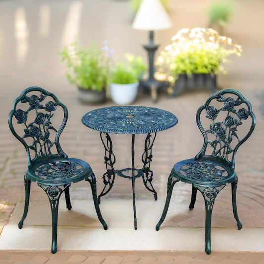 Set of 3 Cast Iron Rose Floral Bistro Table And Chair Green