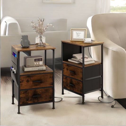 Set Of 2 Bedroom Bedside Nightstand Tables With Charging Station Rustic Brown