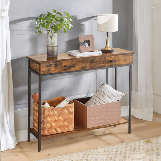 2 Tier Hallway Slim Console Table With 2 Drawers Rustic Brown