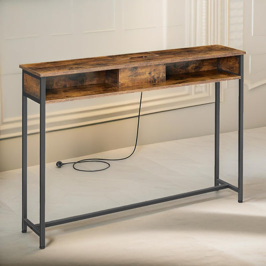 Industrial Wide Console Table With Charging Station Rustic Brown