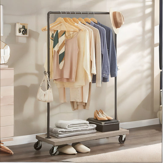 Industrial Clothes Rack With Wheels Open Wardrobe Light Brown