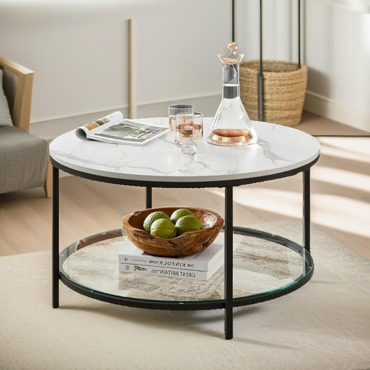 2 Tier Round Faux Marble Coffee Table White