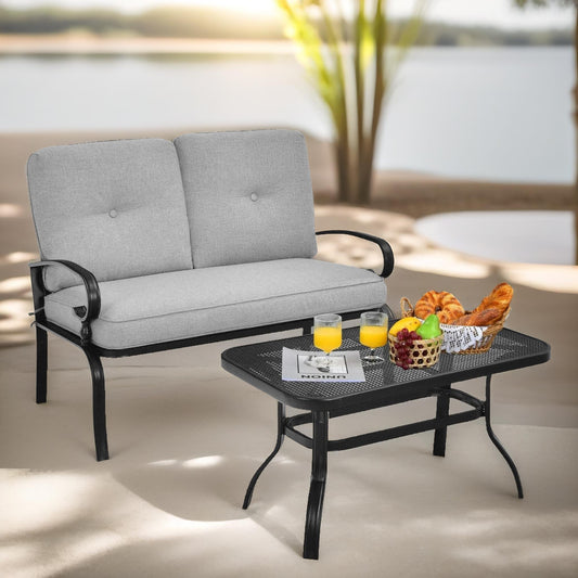 2 Seater Outdoor Bench With Padded Cushions And Table Grey
