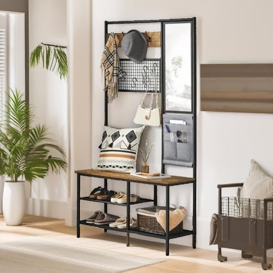 Industrial Coat Rack Stand Hall Tree With Shoe Storage Brown