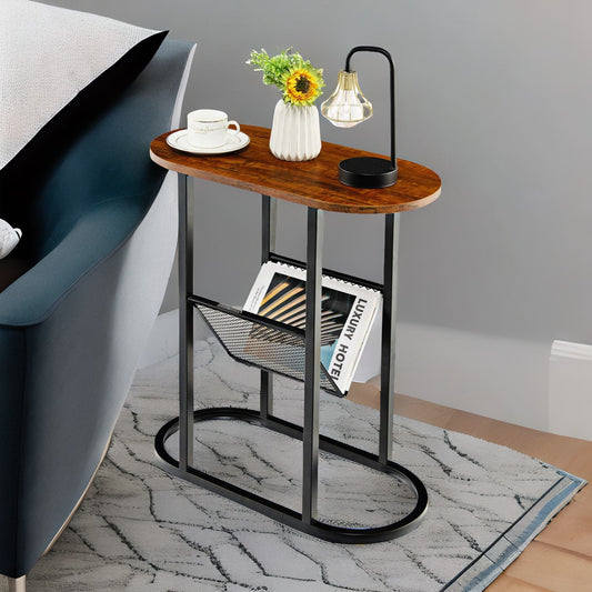 Industrial Side Table With Mesh Magazine Holder Rustic Brown