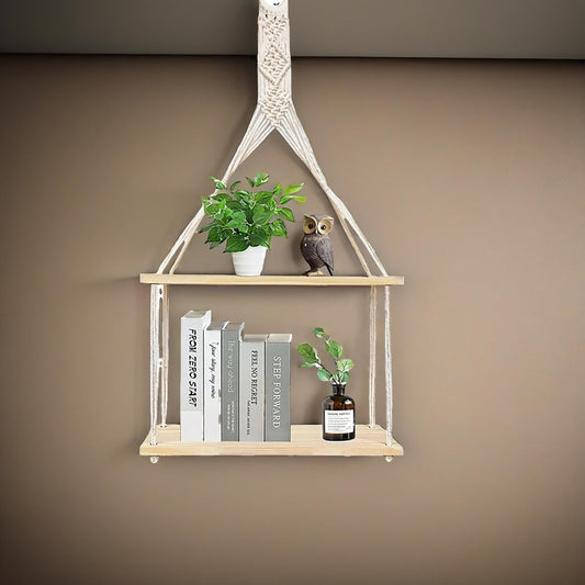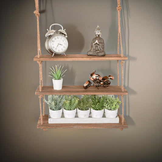 3 Tier Wooden Hanging Shelves With Rope Detail