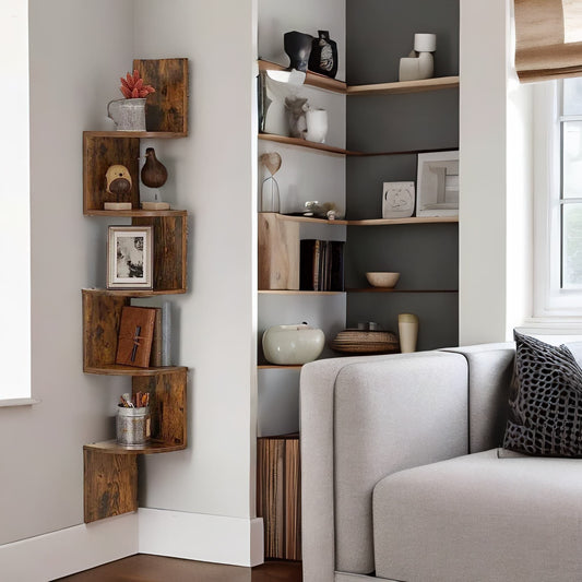 5 Tier Wall Mounted Floating Corner Shelf Rustic Brown